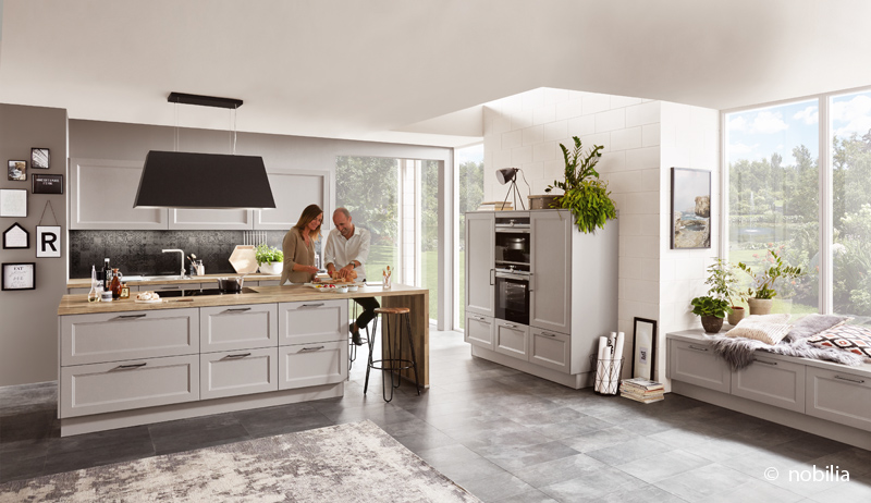 Die L-förmige Küchenzeile mit integrierter Insel ist offen zum Wohnbereich konzipiert. Greige Fronten werden durch ursprüngliche Holzmaserung in Szene gesetzt. Die großzügige Arbeitsfläche bietet Platz für gemeinsames Kochen mit Familie und Freunden.